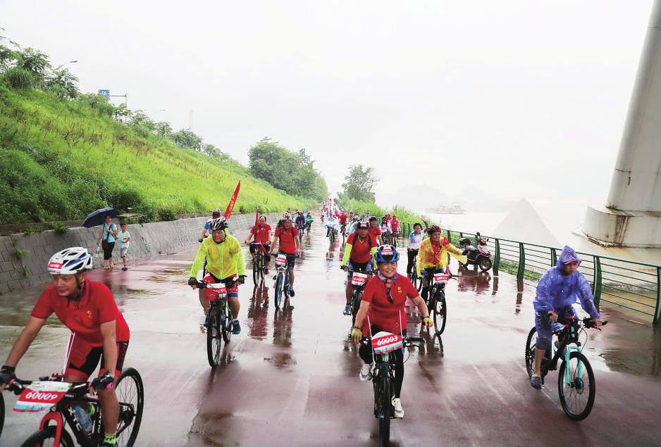 在短暫的熱身運動后,騎行活動正式開始。韓宗桂等領導帶隊率先出發(fā),各支騎行隊伍緊隨其后,一條紅色的火焰瞬間在柳江河畔蔓延開來。騎手們克服雨天路面濕滑的困難和考驗,用手去擦拭流入眼睛的雨水,避免影響視線。大家在騎行過程中相互鼓舞、相互扶持,不拋棄、不放棄,將柳鋼人團結(jié)互助、不畏艱險的精神發(fā)揚光大,參與的職工全部都順利完成了此次騎行。