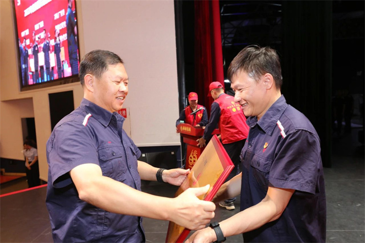 集團(tuán)領(lǐng)導(dǎo)上臺(tái)為獲得先進(jìn)基層黨組織、宣傳文化工作優(yōu)秀單位、優(yōu)秀黨務(wù)工作者、優(yōu)秀共產(chǎn)黨員的集體和個(gè)人頒獎(jiǎng)。